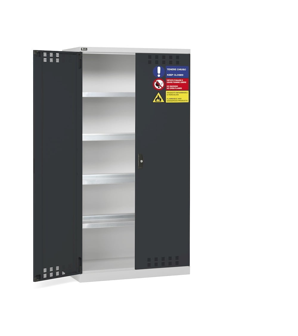In caso di stoccaggio di prodotti che potrebbero inquinare l’ambiente come vernici, solventi, fitofarmaci e altri prodotti chimici è necessario utilizzare armadi metallici con ante a battente dotati di sistemi volti a tutelare l’ambiente e i dipendenti.