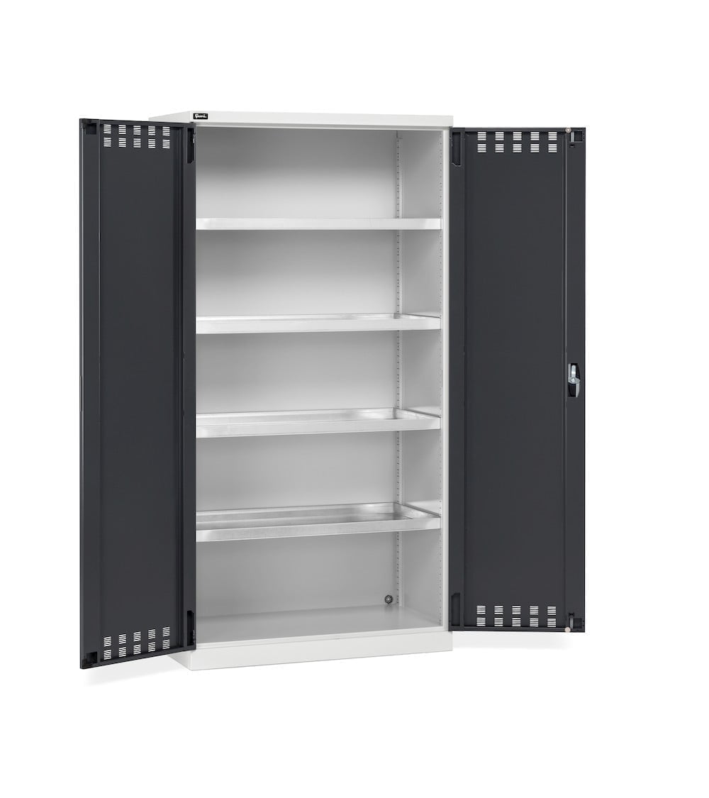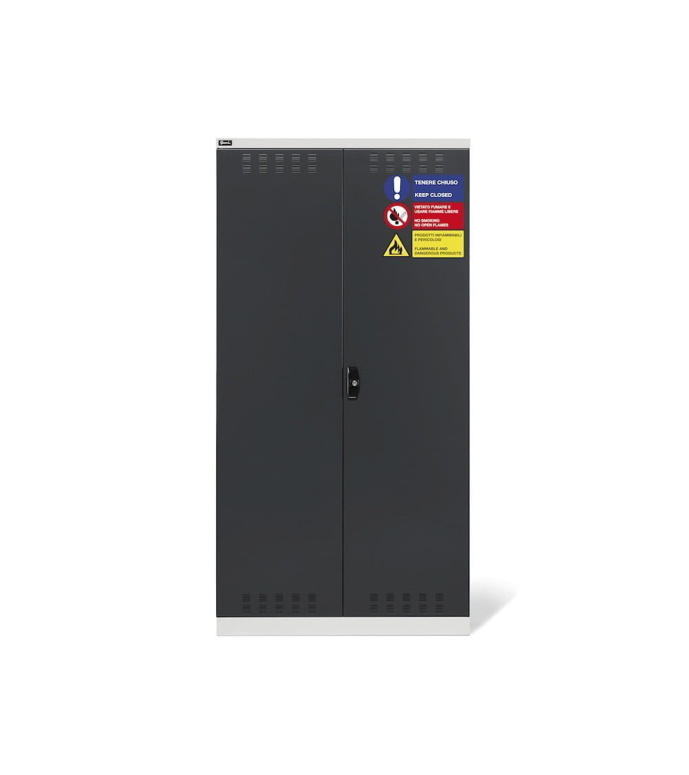 Gli armadi per stoccaggio di sostante pericolose Perfom presentano ante fessurate per il ricambio dell’aria e sono allestiti con vasche a tenuta stagna interne per la raccolta di liquidi che potrebbero fuoriuscire da contenitori danneggiati. La custodia dei prodotti in sicurezza è garantita dalla serratura a cilindro con chiave.