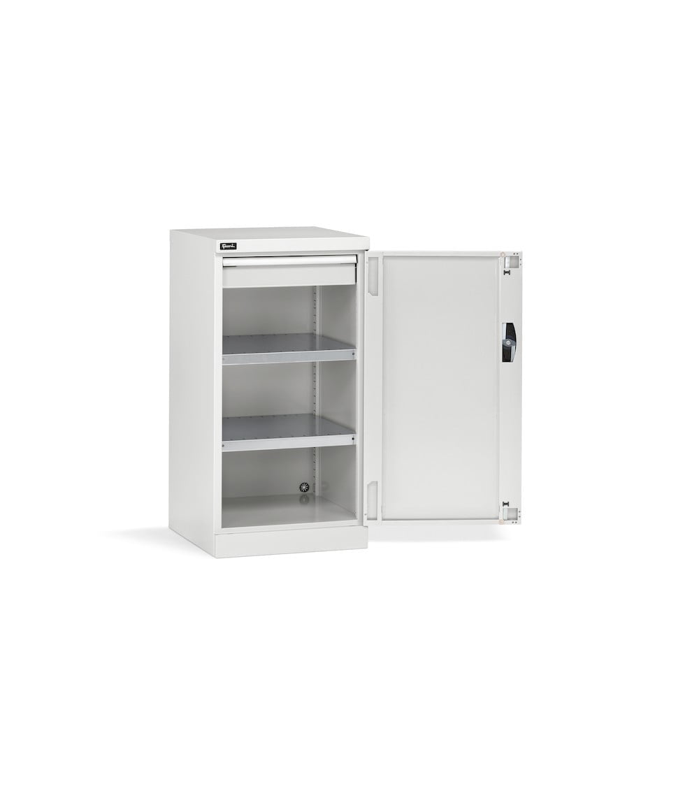 L’interno dell’armadio presenta dei piani fessurati regolabili in altezza per consentire la suddivisione dello spazio interno in base al materiale da stoccare. Utensili, attrezzatura, componenti, documenti possono essere custoditi in sicurezza grazie alla chiusura dotata di serratura a chiave.
