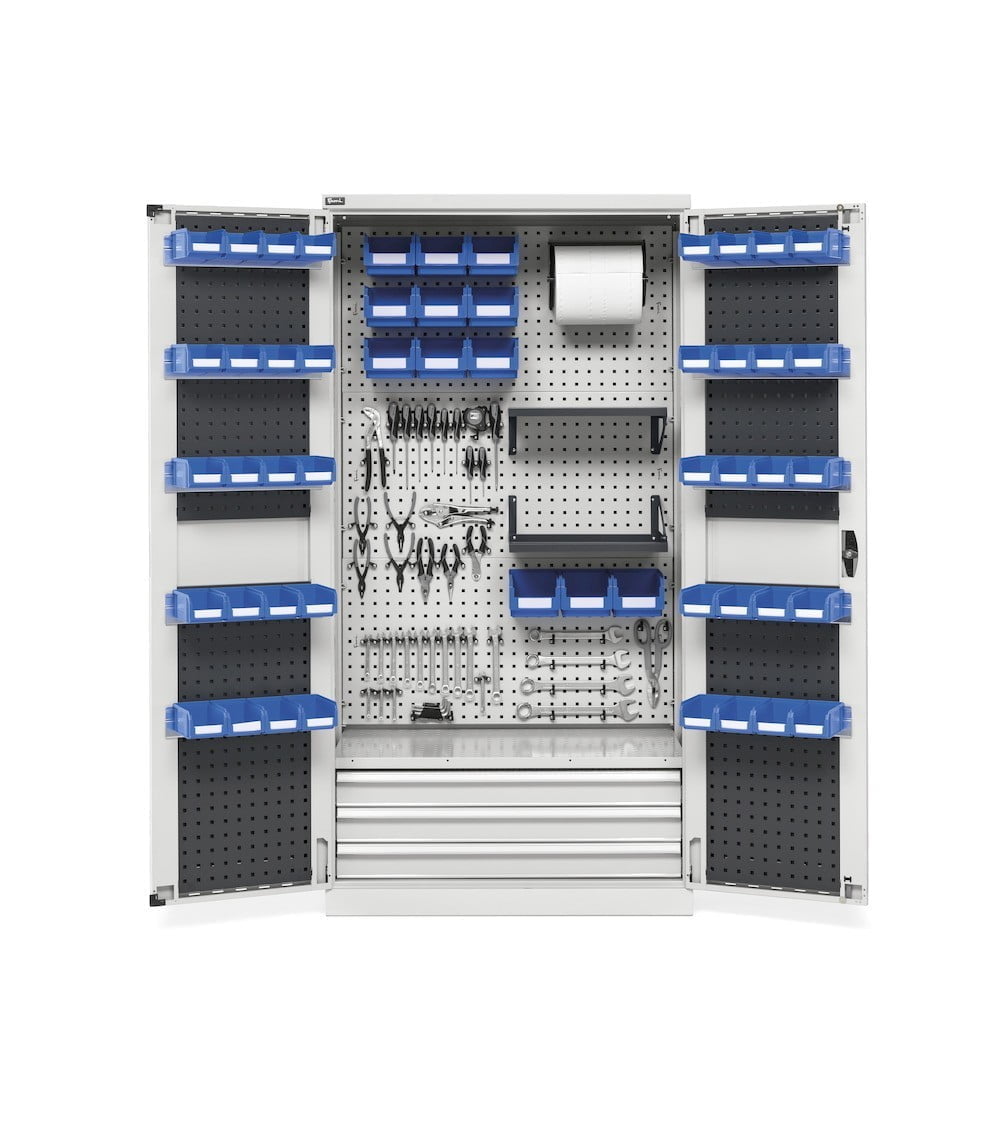 L’armadio portautensili e porta minuteria Perfom è la soluzione ideale per l’organizzazione e lo stoccaggio ordinato di utensili e minuteria. È dotato di ante con pannelli forati con barre aggancio porta contenitori per minuteria e Iron Team e Unipok per utensili e componenti.
