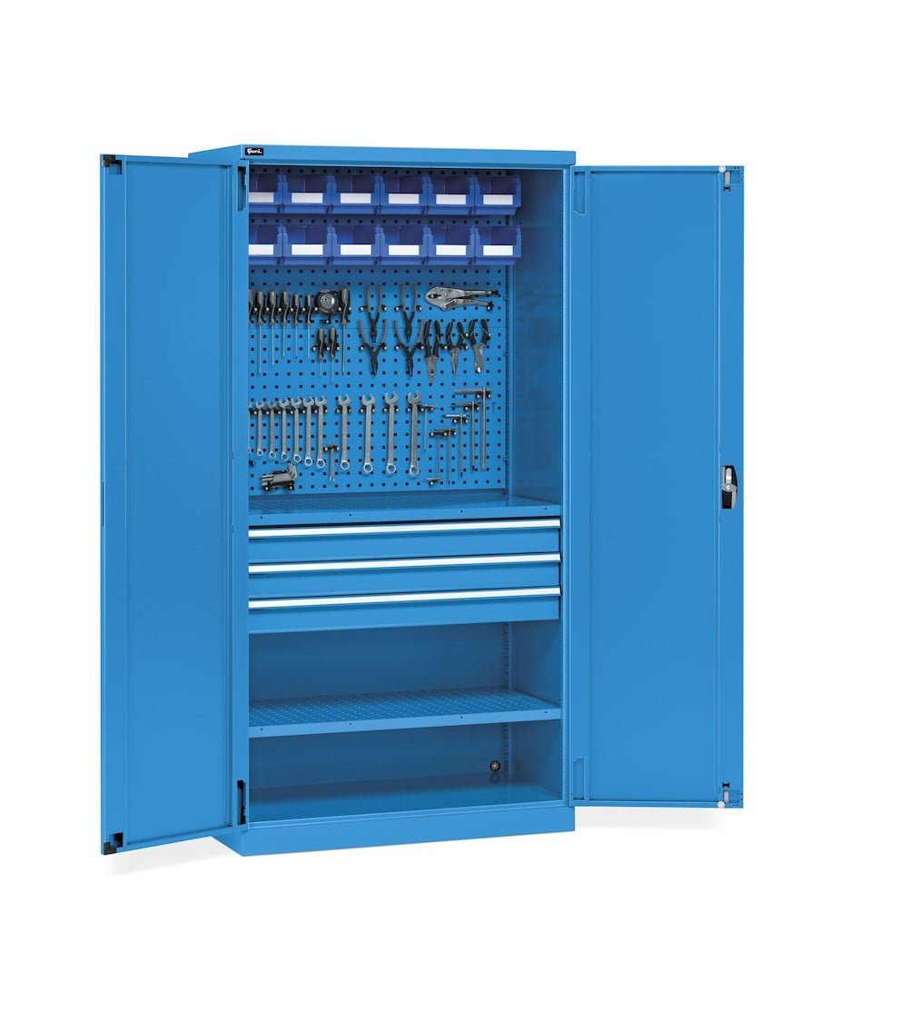 Il fissaggio di accessori e ganci è possibile grazie a piani-pannelli forati installati verticalmente, mentre tre cassetti ad estrazione semplice permettono lo stoccaggio di ulteriori elementi. Le ante a battente sono dotate di serratura a cilindro.