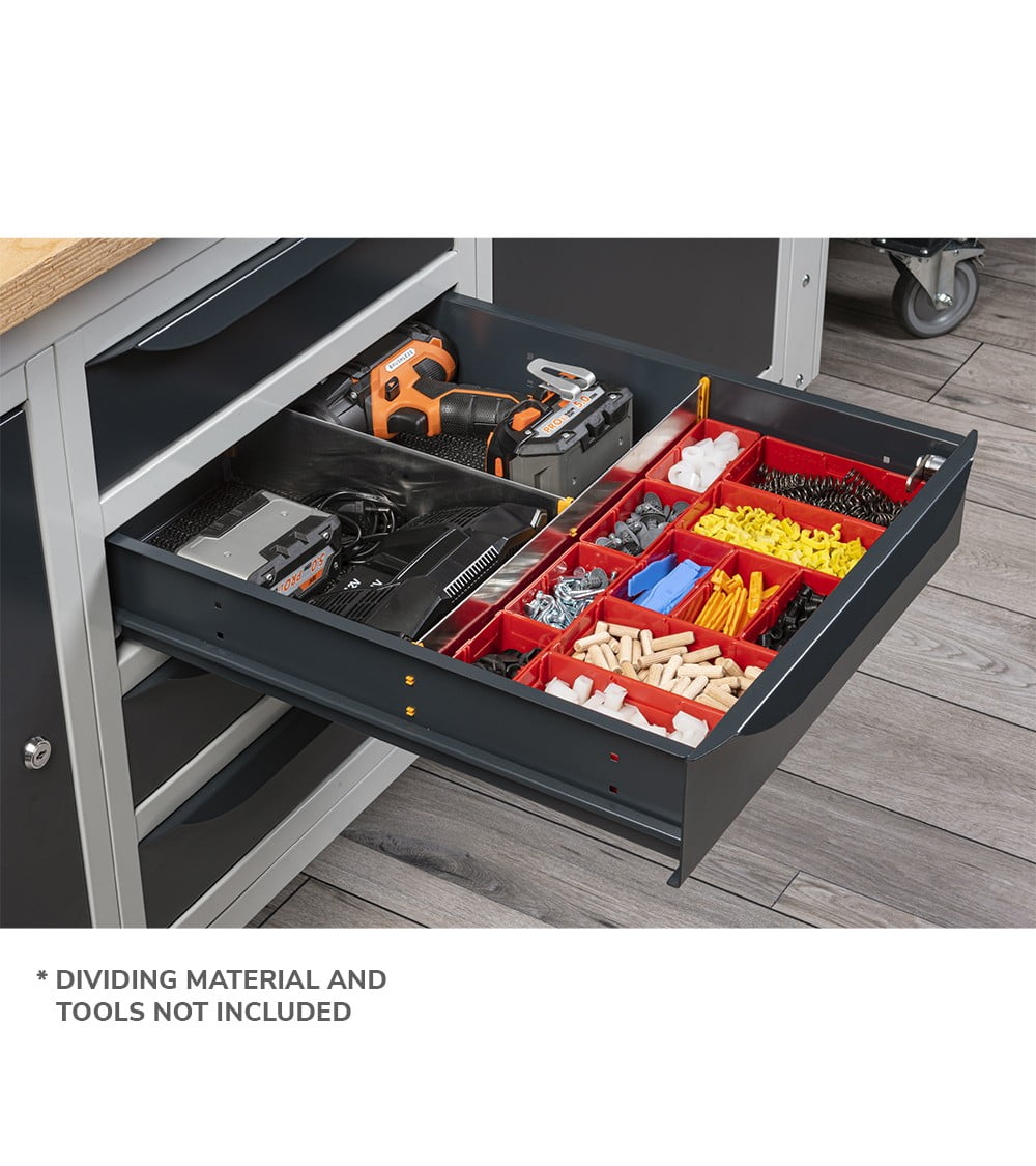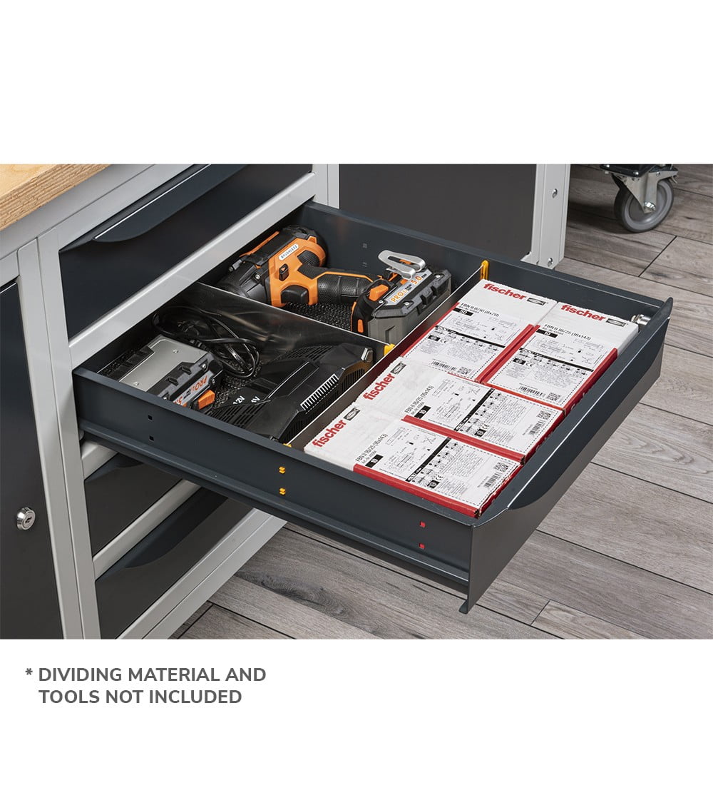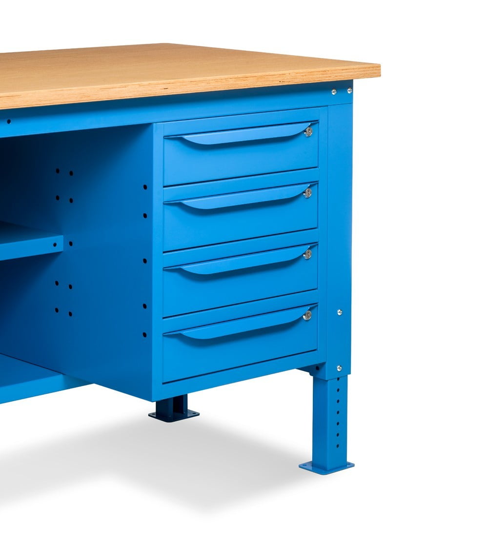 Nella parte inferiore del banco sono installati un armadio a cassetti con 4 cassetti e un armadio con porta per disporre di spazi di dimensioni diverse per lo stoccaggio del materiale.