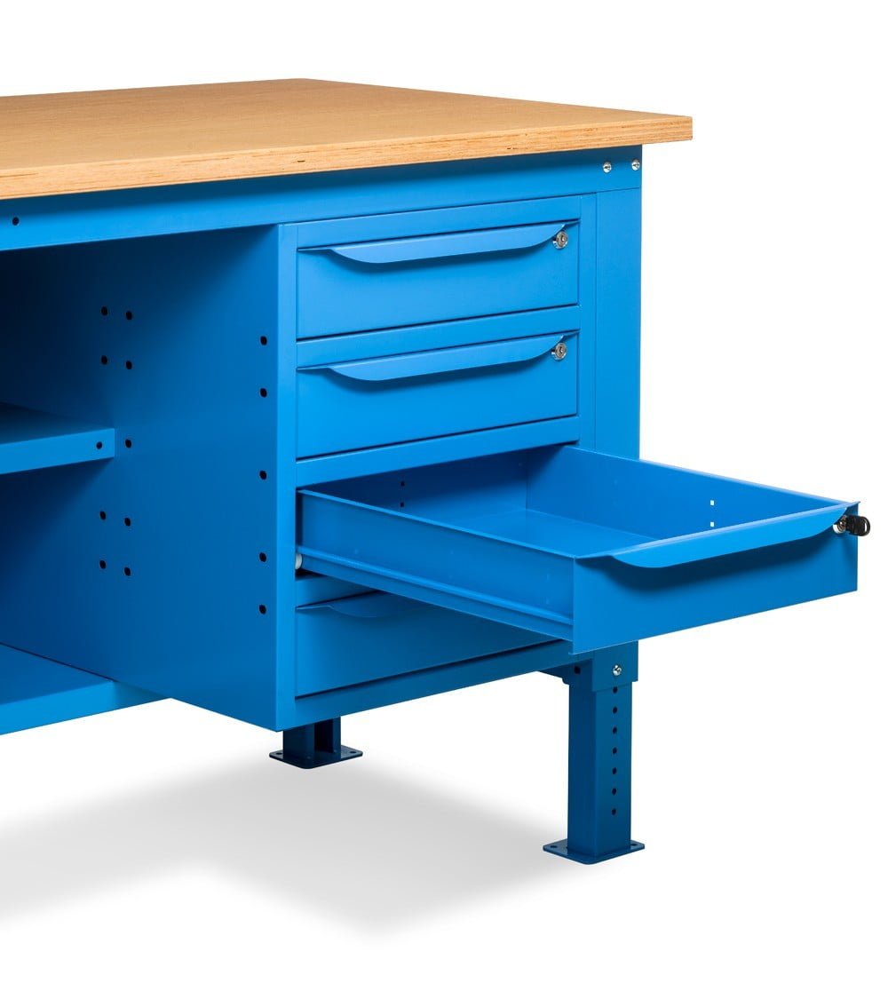 Il piano di lavoro è in multiplex con spessore di 30 mm per poter effettuare operazioni diverse e pesanti. Nella parte inferiore del banco sono installati un armadio a cassetti con 4 cassetti, un armadio con porta e due semipiani per disporre di spazi di dimensioni diverse per lo stoccaggio del materiale.