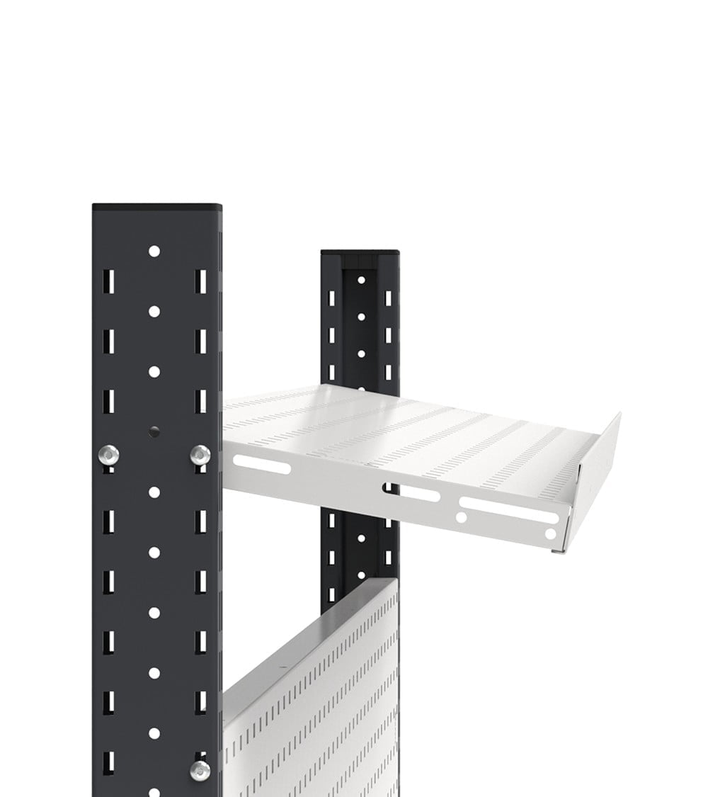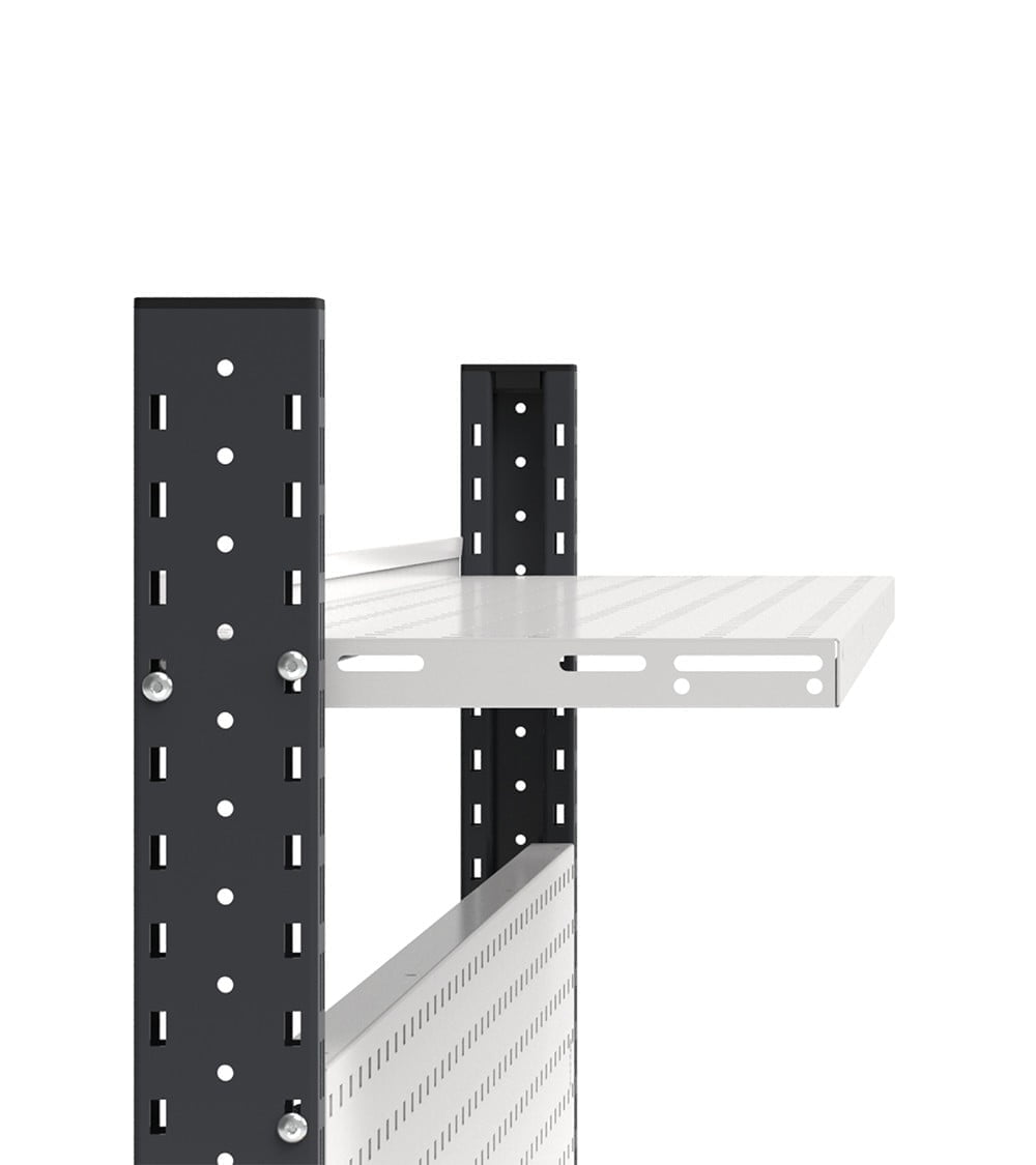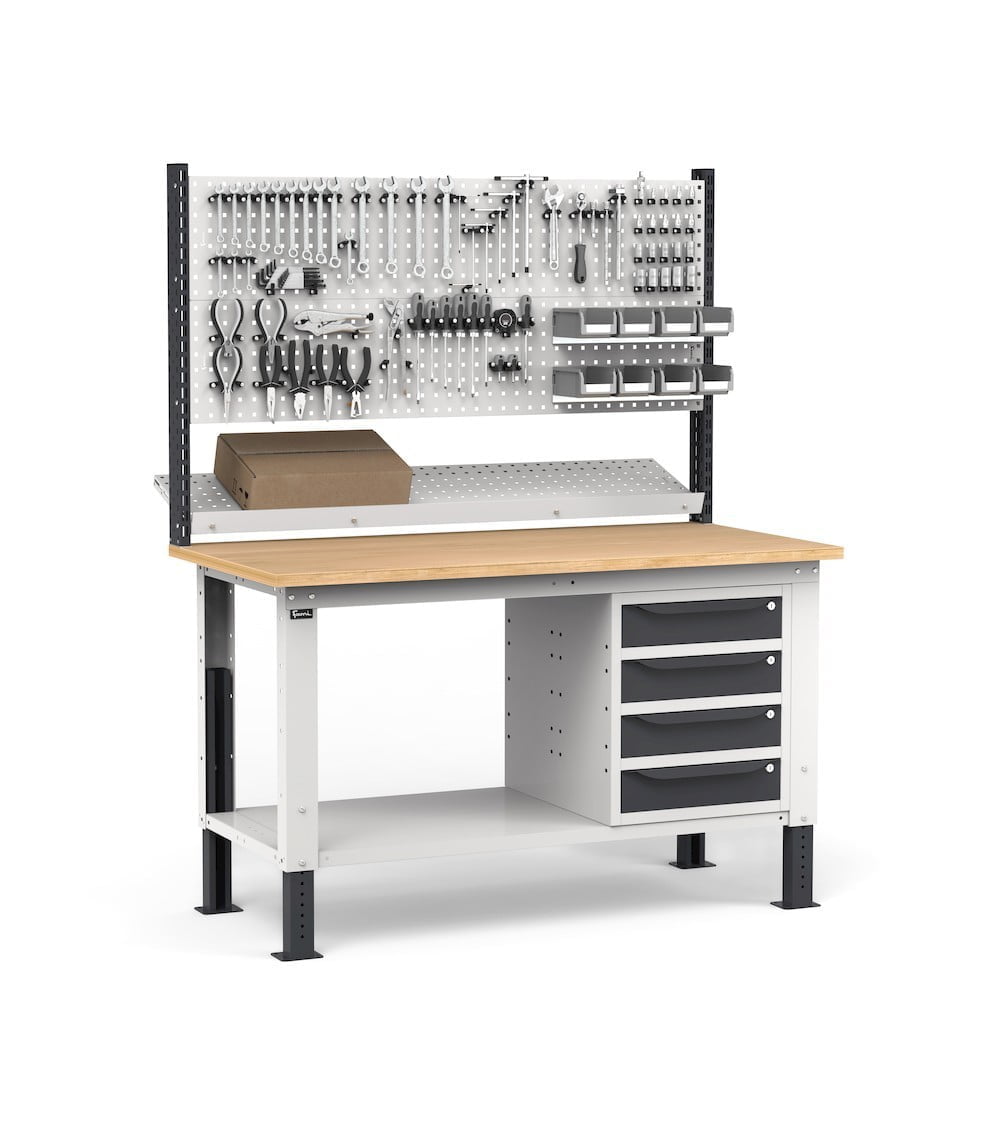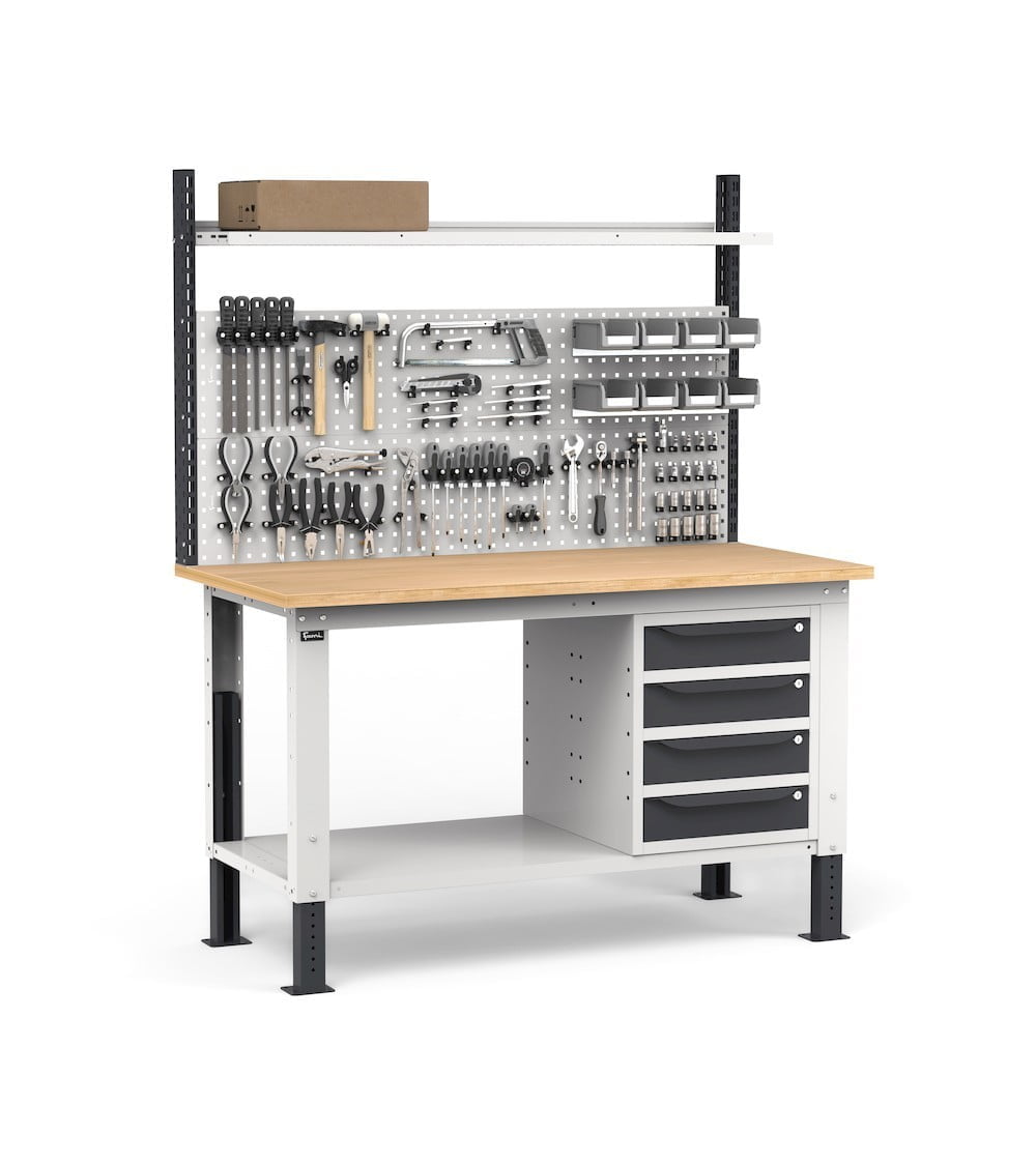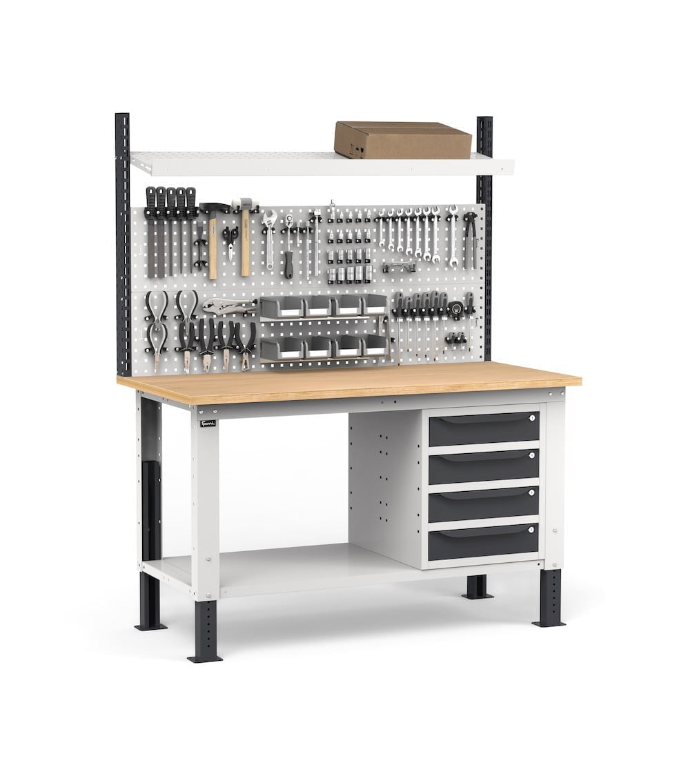 L’organizzazione della postazione di lavoro è facilitata dai numerosi accessori disponibili: armadi a cassetti, armadi con porta, piani e pareti forate consentono una rapida suddivisione degli spazi e lo stoccaggio ordinato ed in sicurezza di utensili, attrezzatura e componenti. Il piano di lavoro può essere protetto tramite coperture in acciaio gommato, resistenti a graffi, oli e liquidi, mentre l’aggiunta di ruote trasforma il banco da lavoro regolabile in altezza in una pratica postazione mobile.