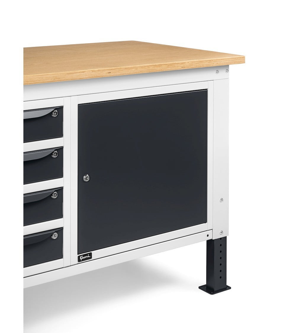 Nella parte inferiore del banco sono installati un armadio a cassetti con 4 cassetti e un armadio con porta per disporre di spazi di dimensioni diverse per lo stoccaggio del materiale.