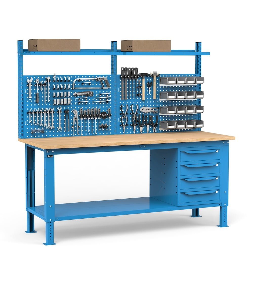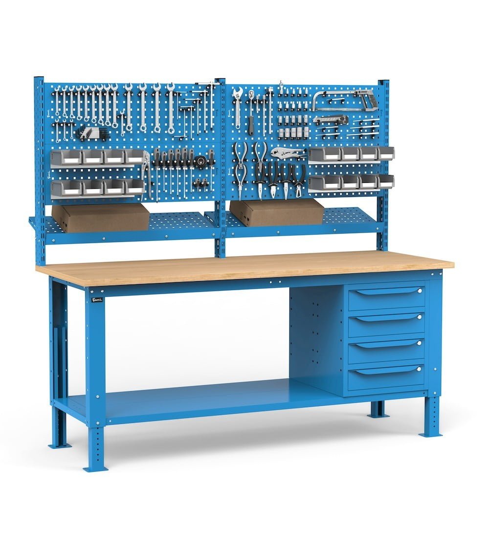 L’organizzazione della postazione di lavoro è facilitata dai numerosi accessori disponibili: armadi a cassetti, armadi con porta, piani e pareti forate consentono una rapida suddivisione degli spazi e lo stoccaggio ordinato ed in sicurezza di utensili, attrezzatura e componenti. Il piano di lavoro può essere protetto tramite coperture in acciaio gommato, resistenti a graffi, oli e liquidi, mentre l’aggiunta di ruote trasforma il banco da lavoro regolabile in altezza in una pratica postazione mobile.