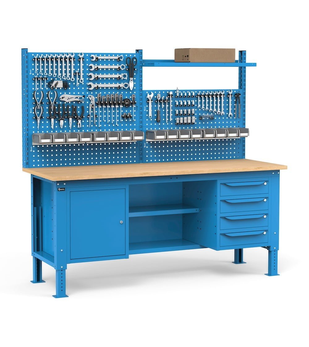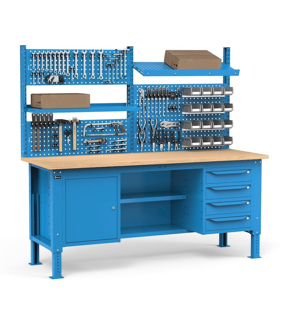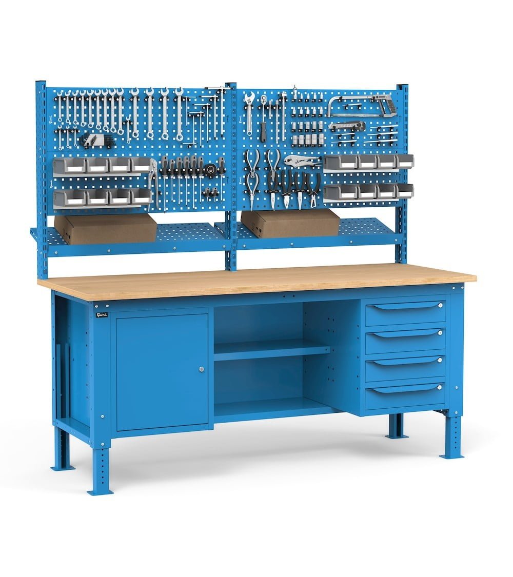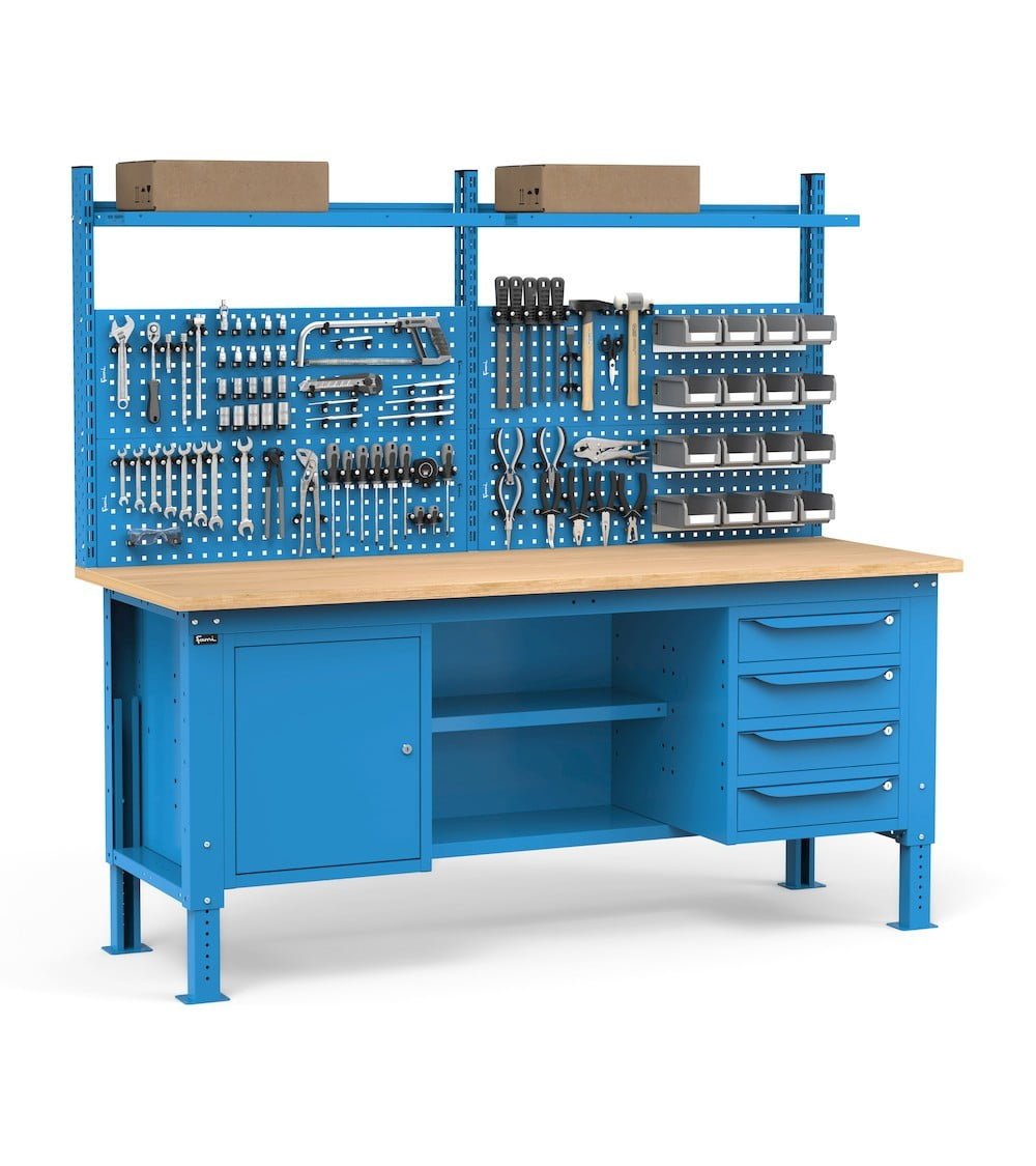 Il banco da lavoro regolabile in altezza Work Up è un componente essenziale per il lavoro quotidiano di artigiani e professionisti. Offre agli operatori la possibilità di organizzare attrezzi e minuteria andandoli a stoccare nell’armadio a cassetto o posizionandoli sul pannello forato con ganci o accessori. Il banco ha un’altezza regolabile tra 732 e 1107 mm.