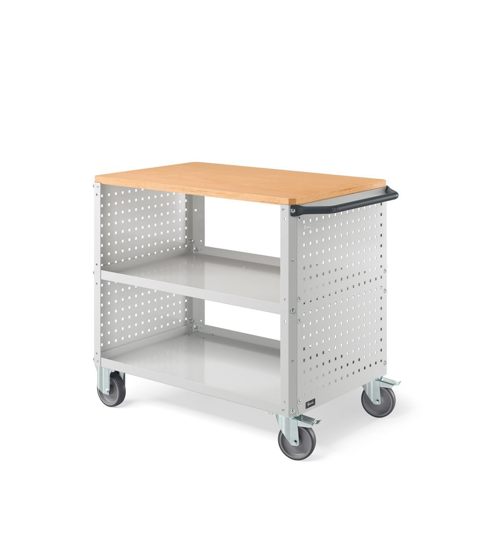 I carrelli industriali Clever Large possono essere utilizzati come carrelli portautensili in numerosi ambiti. Il ripiano superiore in legno consente di disporre di un piano di lavoro in cui effettuare lavorazioni.
