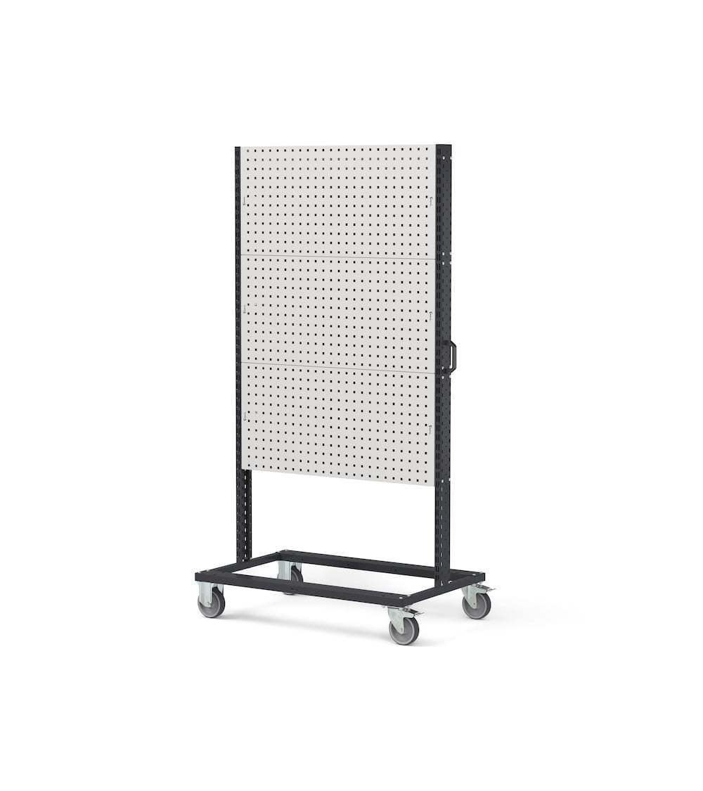 Il carrello con 6 pannelli forati Bin Cart rappresenta la base su cui aggiungere accessori e ganci per creare un carrello portattrezzi e avere così a portata di mano tutto il necessario per effettuare lavorazioni. In alternativa è possibile anche realizzare carrelli lean production andando ad aggiungere sistemi come contenitori a bocca di lupo e bracci estensibili per l’organizzazione dei kit utilizzati nelle catene di assemblaggio. La maniglia laterale e le ruote in gomma antitraccia sintetica rendono la movimentazione più rapida e semplice.