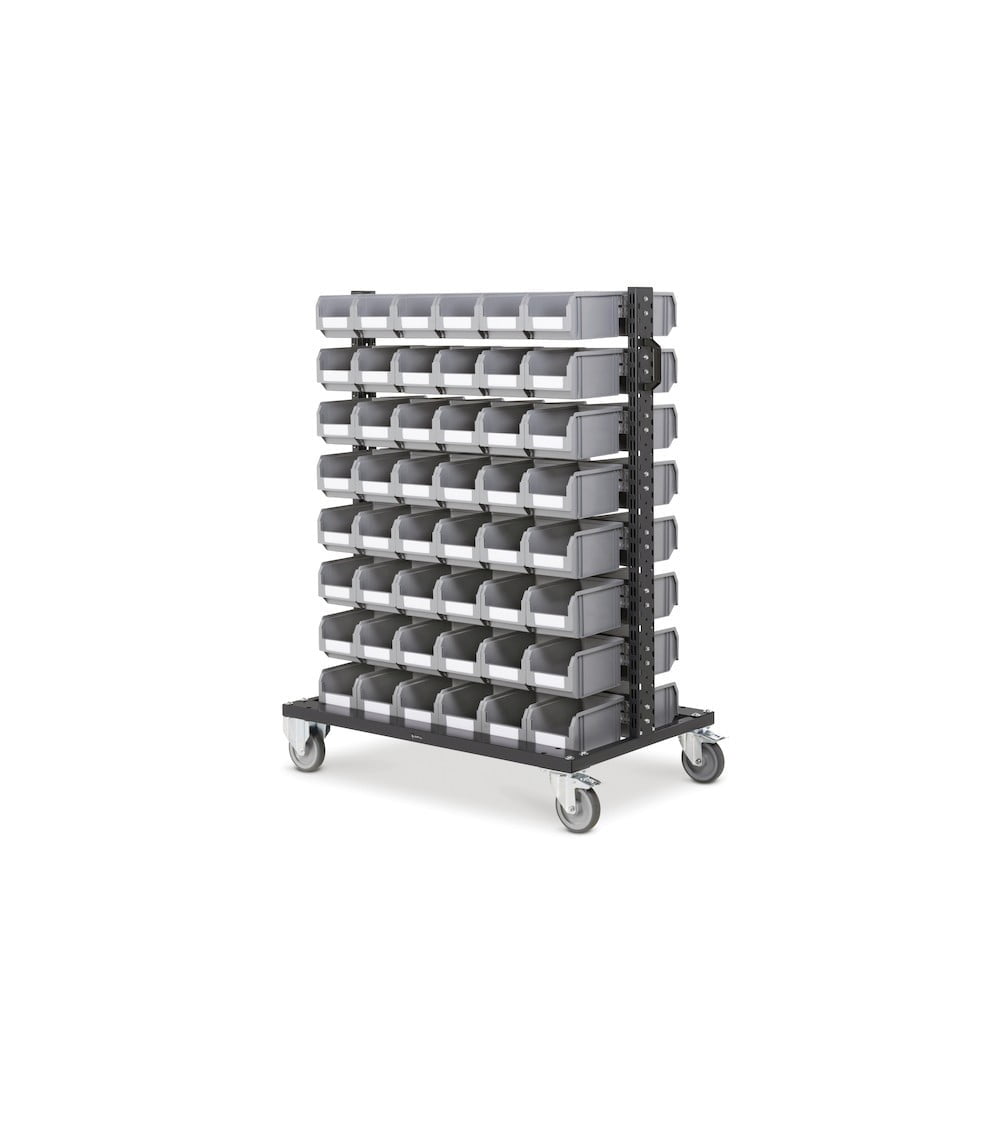 Il carrello in metallo con 96 contenitori bocca di lupo Picking Box consente di disporre di una postazione mobile per l’organizzazione di componenti di piccole dimensioni come minuteria, viteria e ricambi per ottimizzare e rendere più efficiente il lavoro.