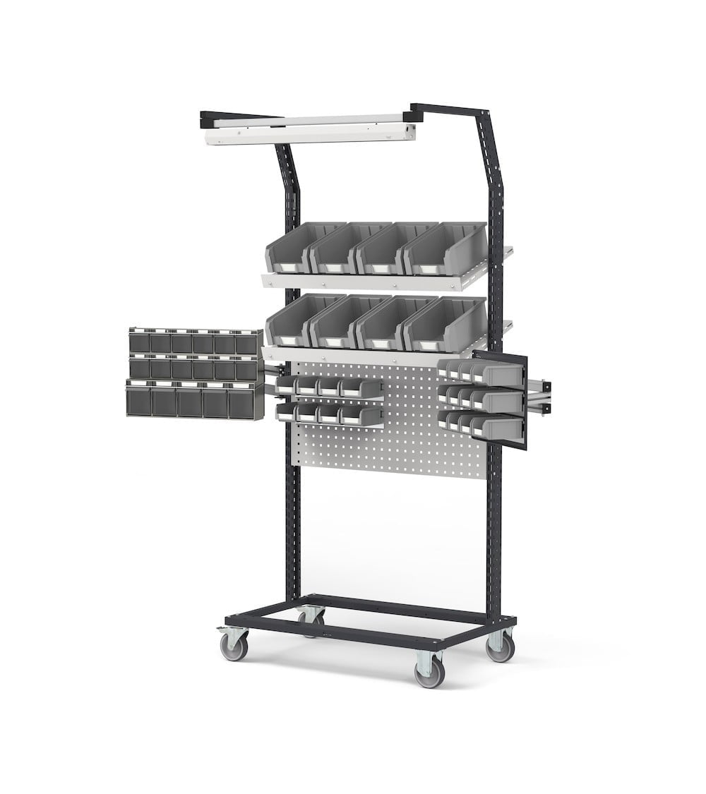 Il carrello con 4 pannelli forati Bin Cart rappresenta la base su cui aggiungere accessori e ganci per creare un carrello portattrezzi e avere così a portata di mano tutto il necessario per effettuare lavorazioni. In alternativa è possibile anche realizzare carrelli lean production andando ad aggiungere sistemi come contenitori a bocca di lupo e bracci estensibili per l’organizzazione dei kit utilizzati nelle catene di assemblaggio. La maniglia laterale e le ruote in gomma antitraccia sintetica rendono la movimentazione più rapida e semplice.