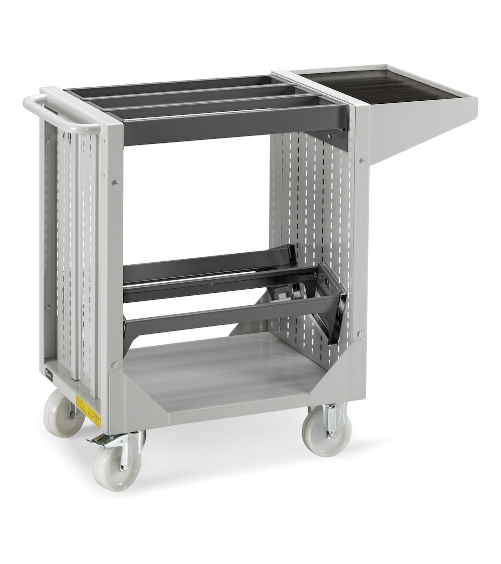 Il carrello portautensili NC con 4 ruote è la postazione di lavoro mobile che consente all’operatore di avere sempre a disposizione utensili e mandrini da utilizzare nei diversi macchinari a controllo numerico. I telai porta boccole sono regolabili in altezza, possono essere posizionati inclinati o orizzontali e permettono l’alloggiamento delle boccole in qualsiasi punto del telaio. Le 4 ruote in nylon rendono facile e rapida la movimentazione del carrello.