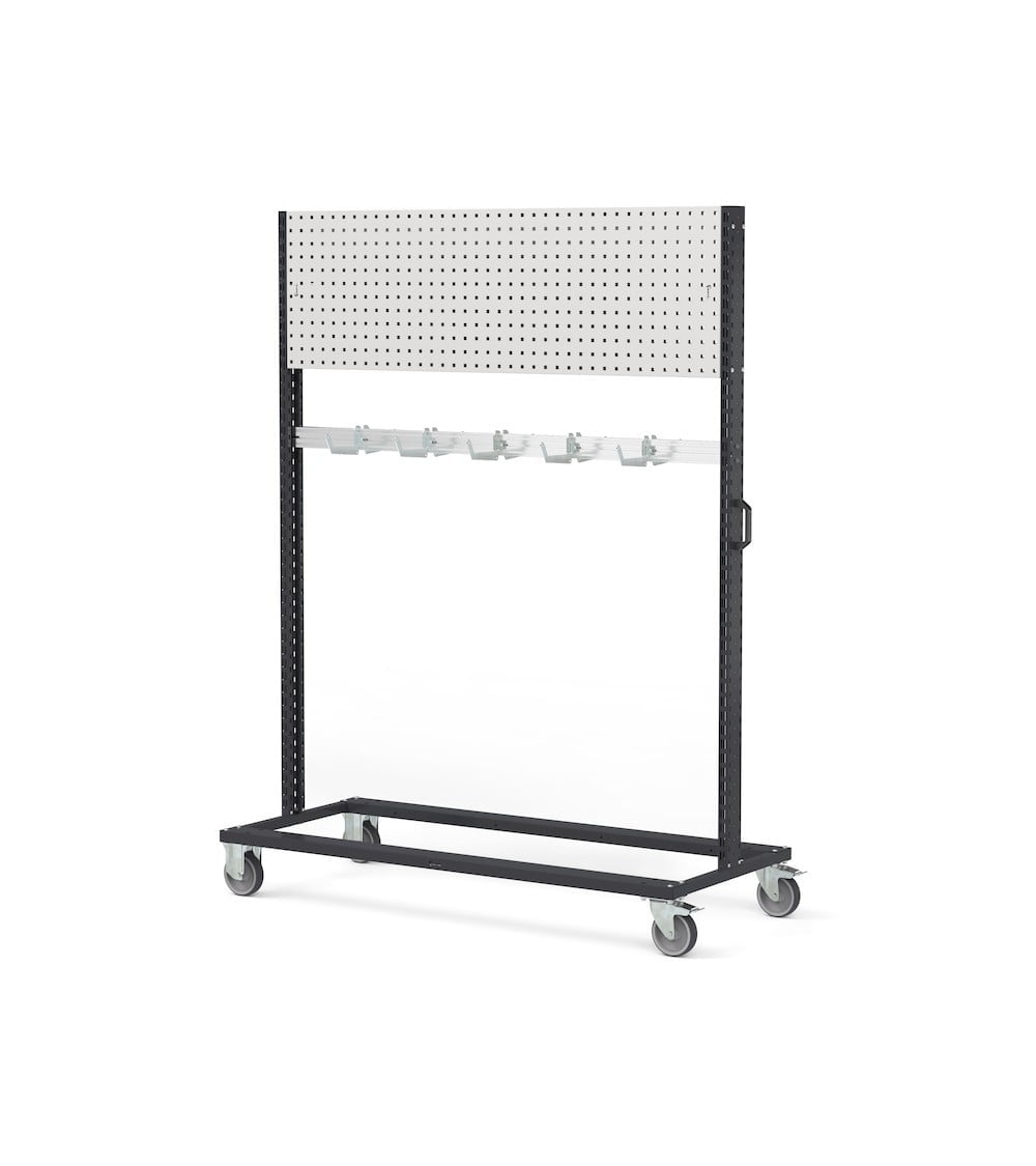 Il carrello con 6 pannelli forati Bin Cart rappresenta la base su cui aggiungere accessori e ganci per creare un carrello portattrezzi e avere così a portata di mano tutto il necessario per effettuare lavorazioni. In alternativa è possibile anche realizzare carrelli lean production andando ad aggiungere sistemi come contenitori a bocca di lupo e bracci estensibili per l’organizzazione dei kit utilizzati nelle catene di assemblaggio. La maniglia laterale e le ruote in gomma antitraccia sintetica rendono la movimentazione più rapida e semplice.