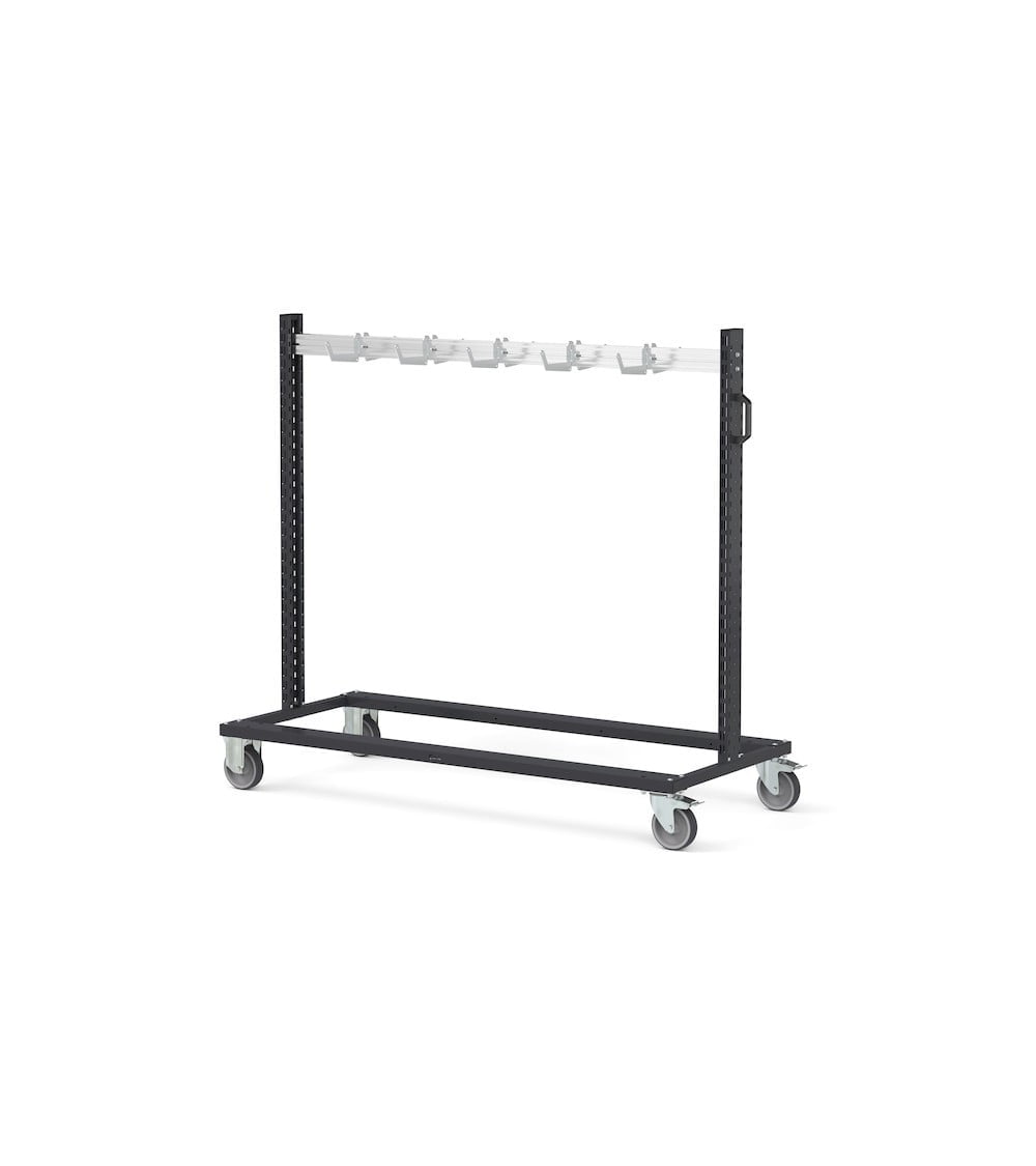 Il carrello rastrelliera Bin Cart consente lo stoccaggio e la movimentazione ordinata e sicura di materiali e componenti particolarmente lunghi. È caratterizzato da coppie di supporti installati a diverse altezze sui montanti su cui è possibile posizionare in completa sicurezza tubi, traverse o pali grazie alla gomma antiscivolo e ai fermi anticaduta frontali. Presenta dei profili in alluminio per irrobustire la struttura e su cui possono essere installati ulteriori elementi come ganci porta cavi. Il carrello è completato da maniglia laterale e da ruote in gomma antitraccia sintetica.