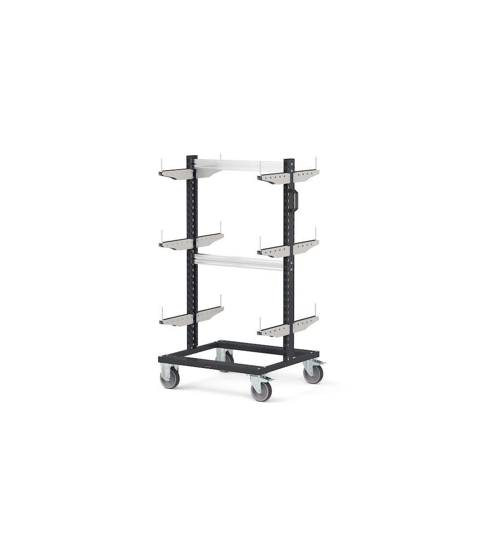 Il carrello rastrelliera Bin Cart consente lo stoccaggio e la movimentazione ordinata e sicura di materiali e componenti particolarmente lunghi. È caratterizzato da coppie di supporti installati a diverse altezze sui montanti su cui è possibile posizionare in completa sicurezza tubi, traverse o pali grazie alla gomma antiscivolo e ai fermi anticaduta frontali. Presenta dei profili in alluminio per irrobustire la struttura e su cui possono essere installati ulteriori elementi come ganci porta cavi. Il carrello è completato da maniglia laterale e da ruote in gomma antitraccia sintetica.
