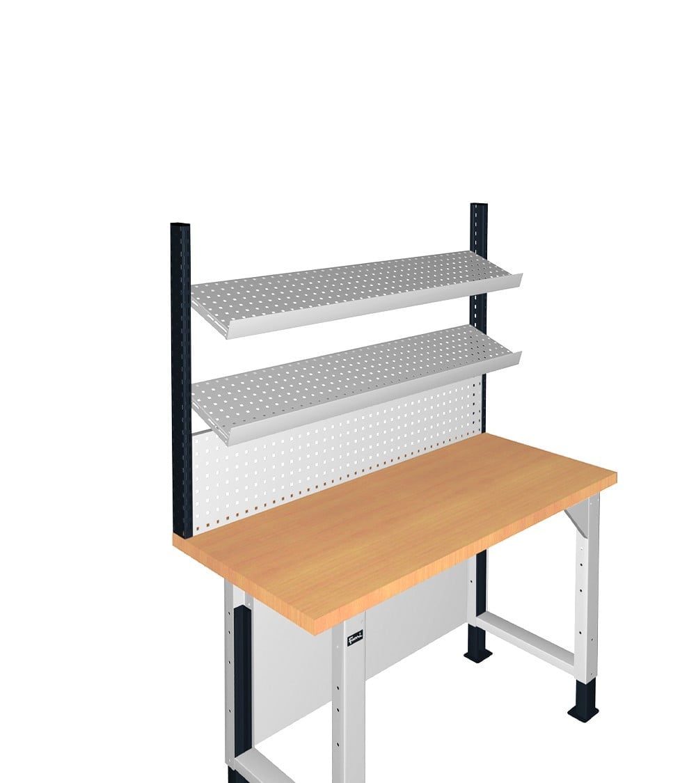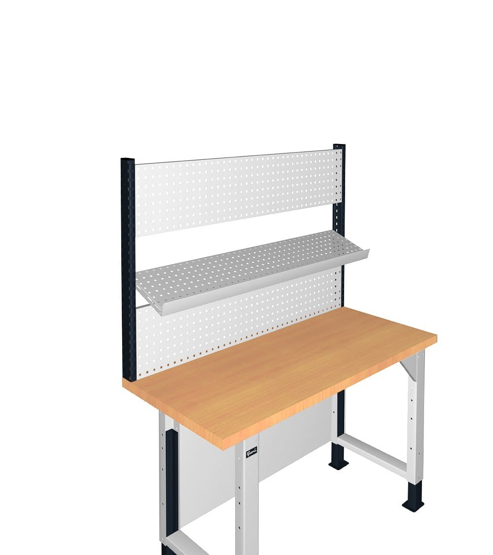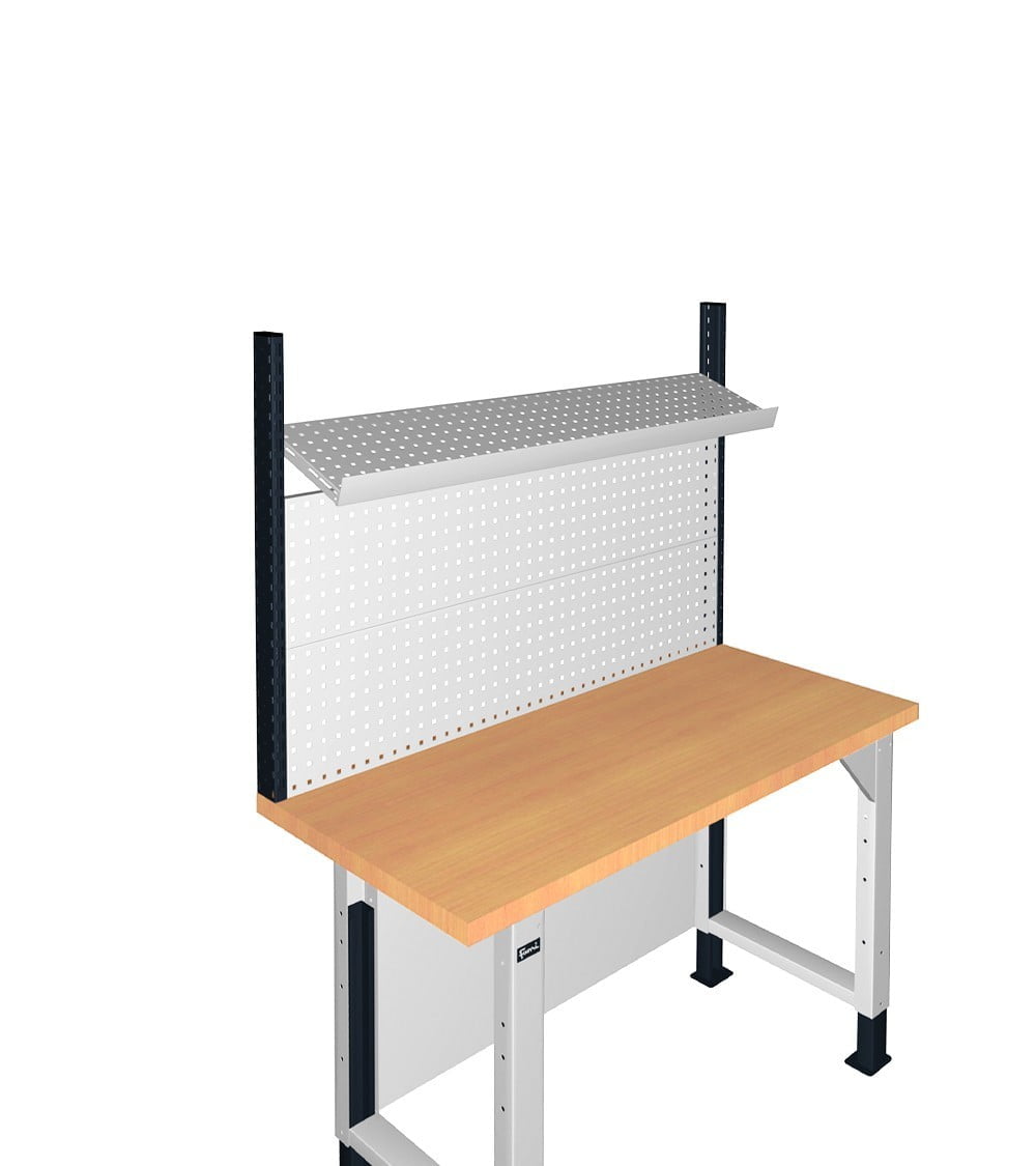 Questo pacchetto consente di avere a disposizione tutto il necessario per installare la propria parete attrezzata sul banco da lavoro. I due montati vengono posizionati ai lati del banco, mentre il pannello forato può essere utilizzato sia come supporto per il fissaggio di ganci ed accessori sia come mensola orizzontale od inclinata. In quest’ultimo caso deve essere installato anche il bordo fermacassa per evitare la caduta del materiale posizionato sopra alla mensola.
